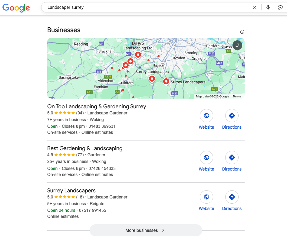 Being visible on Google Maps isn’t just a perk — it’s essential to being found by customers in your local area. At SEO Surrey by Footprint Digital, we specialise in helping businesses optimise their presence on Google Maps, ensuring they stand out when customers search for services nearby. Our Google Maps SEO service is designed to improve your business’s visibility, attract local customers, and build a strong online reputation, all while delivering measurable results.
